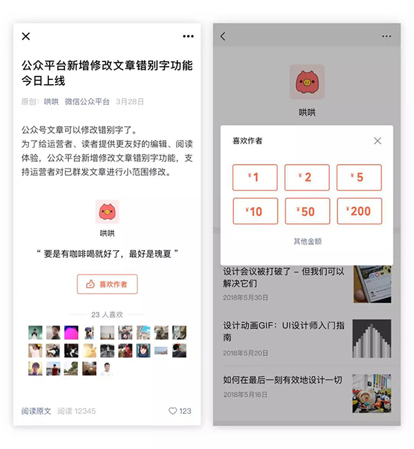 公眾號贊賞功能升級為“喜歡作者”,開啟了贊賞的文章在原創文章底部有“喜歡作者”的入口。在 iOS 版和 Android 版微信上都可以使用。