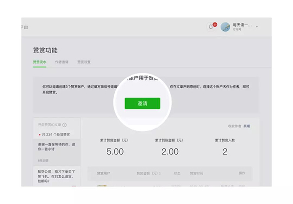 有邀請權限的公眾號在“贊賞功能”里填寫微信號發送創建邀請。