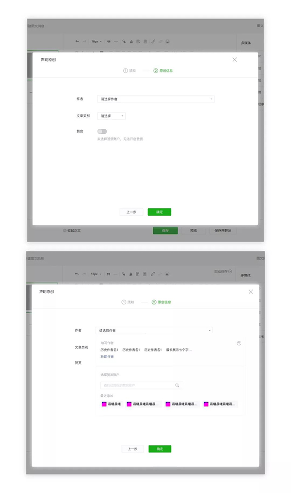 公眾號對文章聲明原創時,輸入贊賞賬戶名進行查找。選擇了贊賞賬戶的文章可以開啟贊賞。