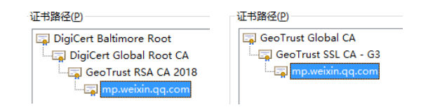 微信公眾平臺(tái)的服務(wù)器證書支持多域名,即API域名(api.weixin.qq.com)與API容災(zāi)域名(api2.weixin.qq.com)使用同一張證書,正常情況下請(qǐng)使用api.weixin.qq.com域名,新證書與舊證書的證書鏈區(qū)別如下:(左邊新,右邊舊)。