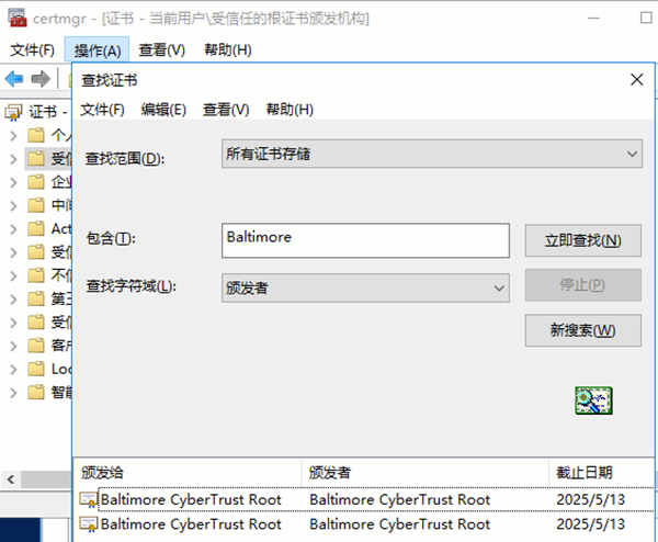 或者在控制臺(tái)窗口運(yùn)行certmgr.msc,在操作菜單欄中打開查找證書,在所有頒發(fā)給域中搜索包含Baltimore,如果顯示有頒發(fā)給BaltimoreCyberTrustRoot的證書則不需要更新證書。