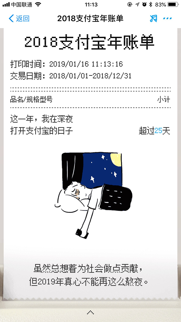 第一頁(yè)賬單統(tǒng)計(jì)了深夜打開支付的次數(shù),最后強(qiáng)調(diào)“2019年真心不能再這么熬夜”,關(guān)心到用戶的健康問題方面。