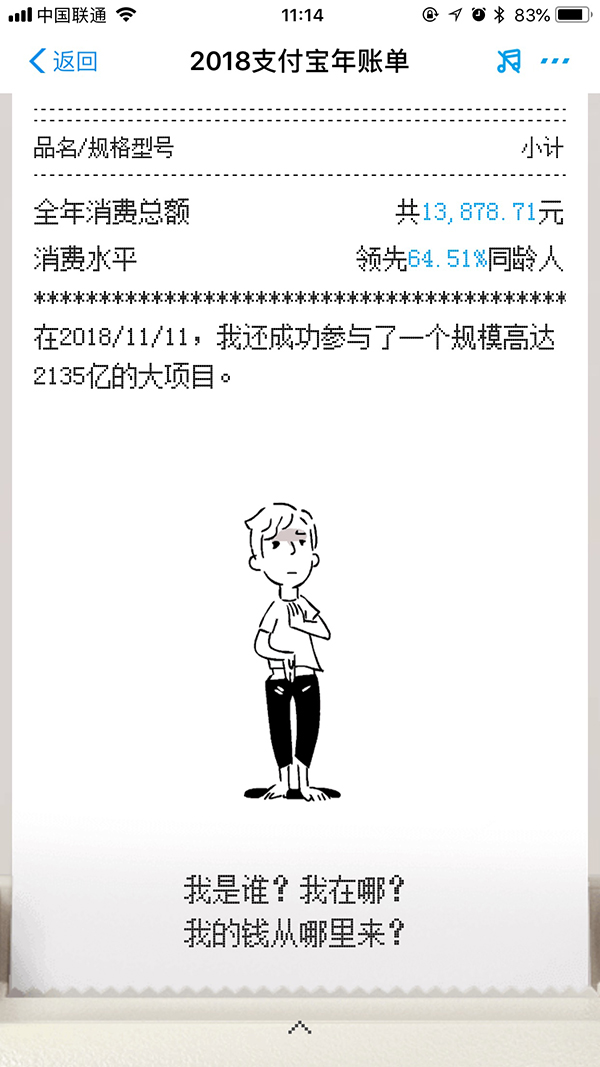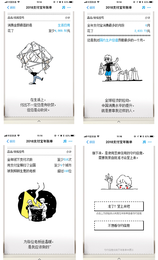 或許賬單會(huì)遲到,但卻永遠(yuǎn)不會(huì)缺席。上周,支付寶年賬單在微信朋友圈開始雙刷屏,自覺花錢如流水的網(wǎng)友,紛紛以各種“不忍直視!”的詼諧表達(dá)來(lái)調(diào)侃自己。不過,今年的支付寶賬單與往年有所不同,2018年度支付寶賬單采用了流水小票概念設(shè)計(jì),看上去相當(dāng)有創(chuàng)意,整個(gè)賬單就像一張從打印機(jī)中慢慢打印出來(lái)的購(gòu)物小票,每一頁(yè)都配有相應(yīng)的簡(jiǎn)筆畫。