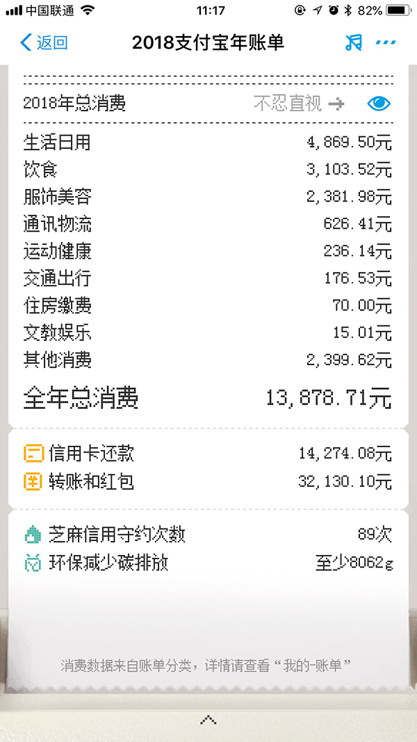 第二頁(yè)賬單統(tǒng)計(jì)了你去年一年的消費(fèi)總額,以及在全國(guó)用戶中的水平,這簡(jiǎn)直就是一年中最為富有的時(shí)刻。