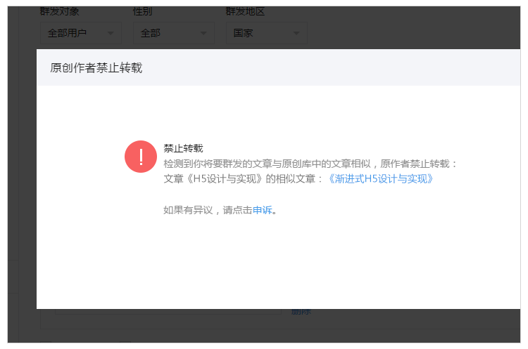 3. 設置為禁止轉載的文章,所有公眾號無法轉載。