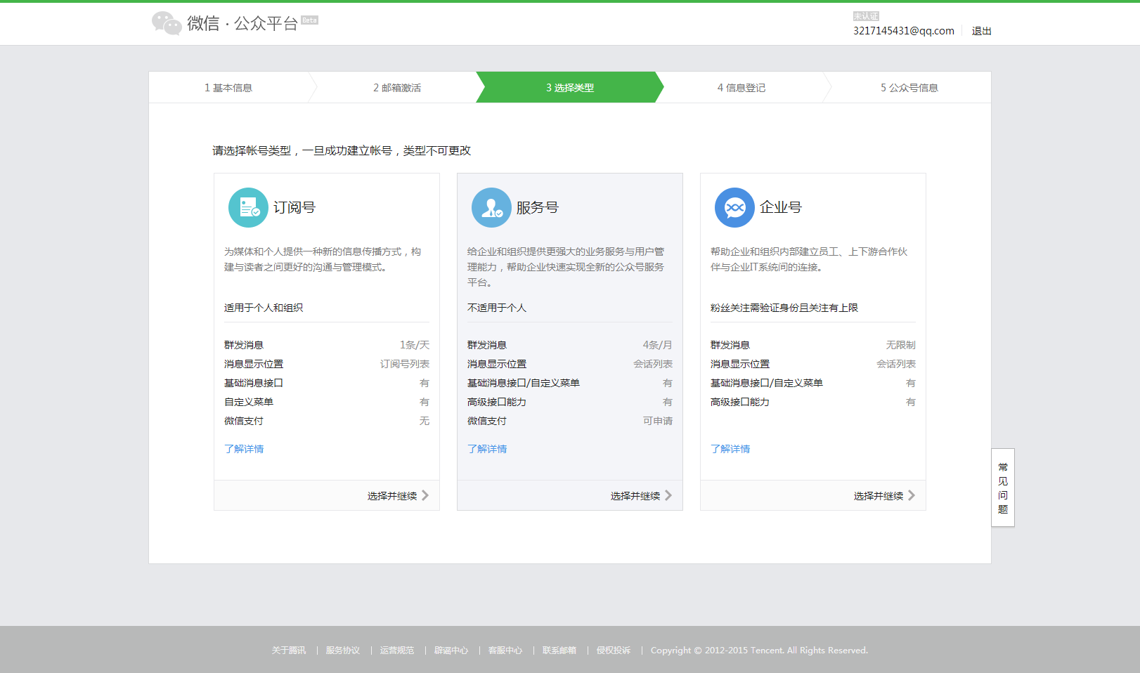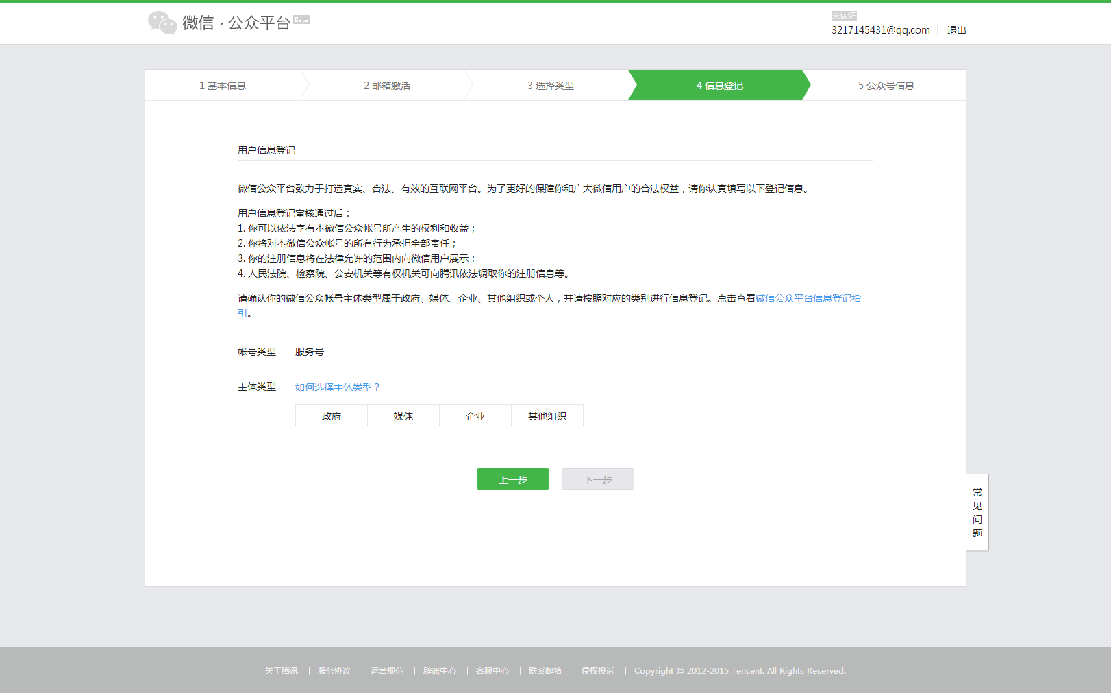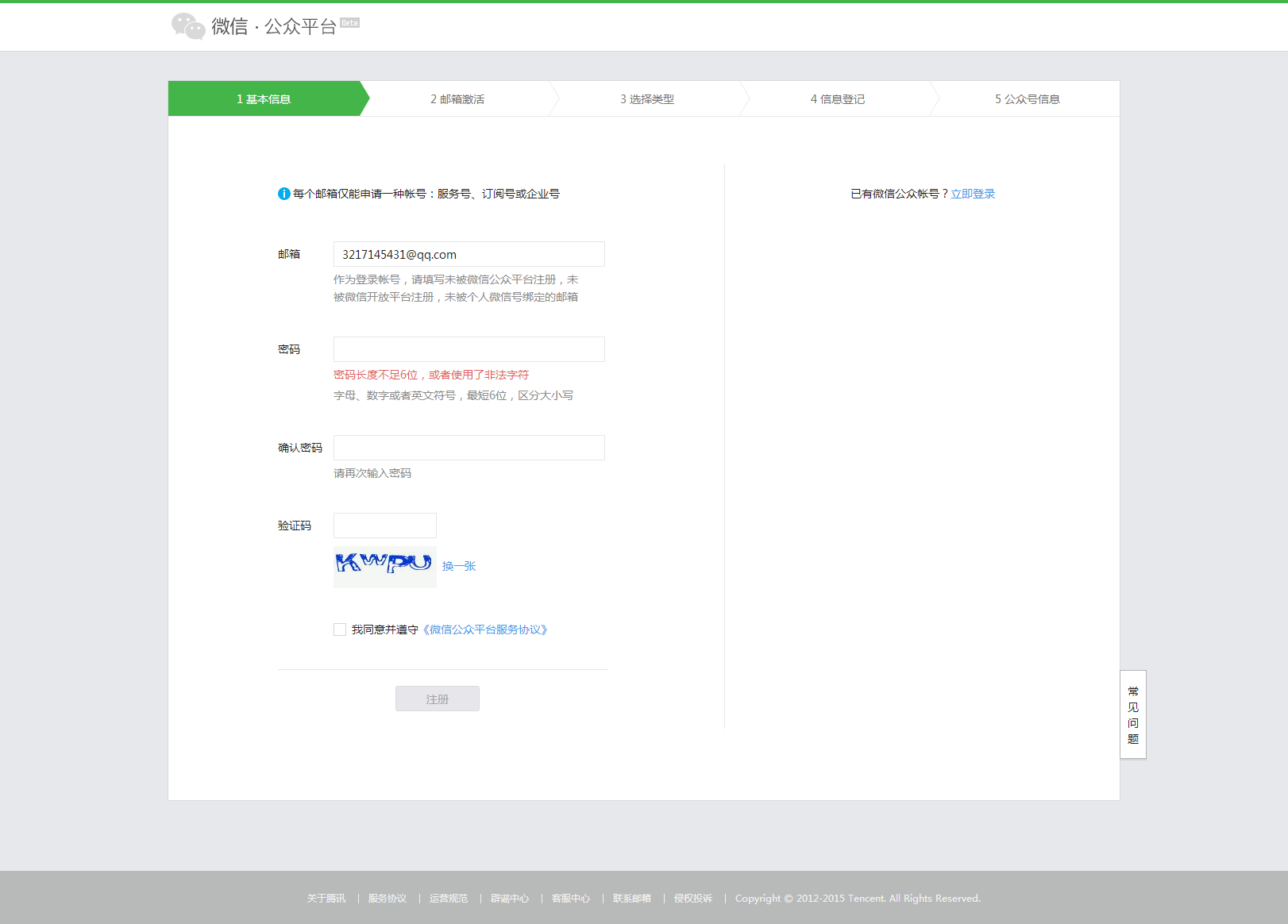 2、注冊過QQ賬號以后,登錄到https://mp.weixin.qq.com/的頁面,進行企業(yè)微信服務(wù)號的注冊。如圖:
