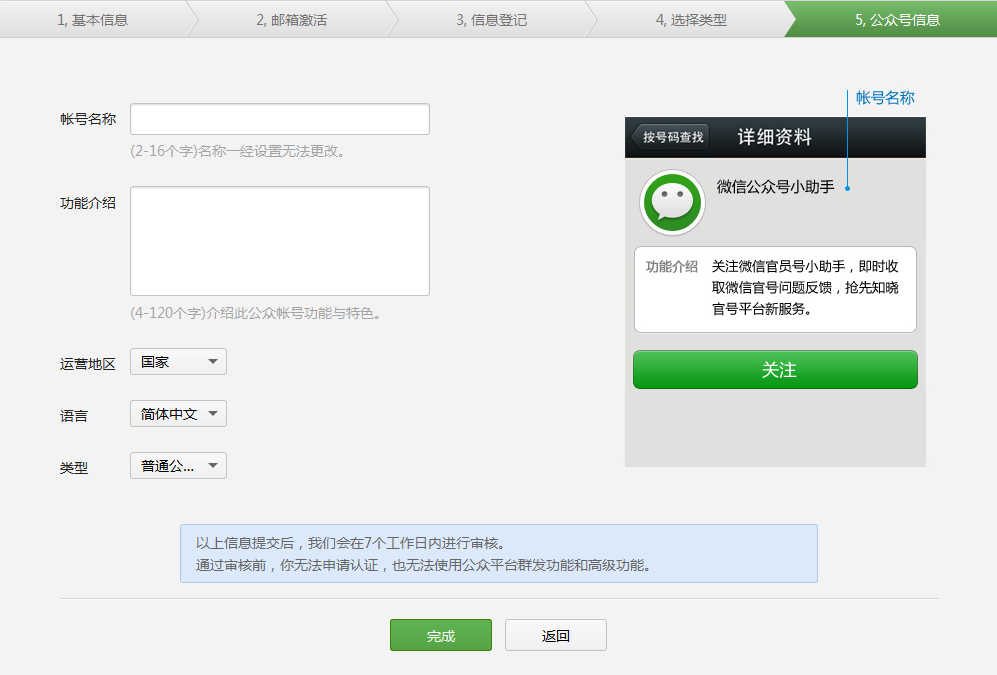 8、我們點擊“繼續(xù)”后,就直接到了“公眾號信息”選項卡里面,在這里我們要輸入帳號名稱、功能介紹、地區(qū)等信息認真填寫,在功能欄里一本是填寫企業(yè)簡介。帳號名稱也只有一次機會,確定后是不能更改的。所有填寫完成后,我們直接點擊“完成”。如下圖所示: