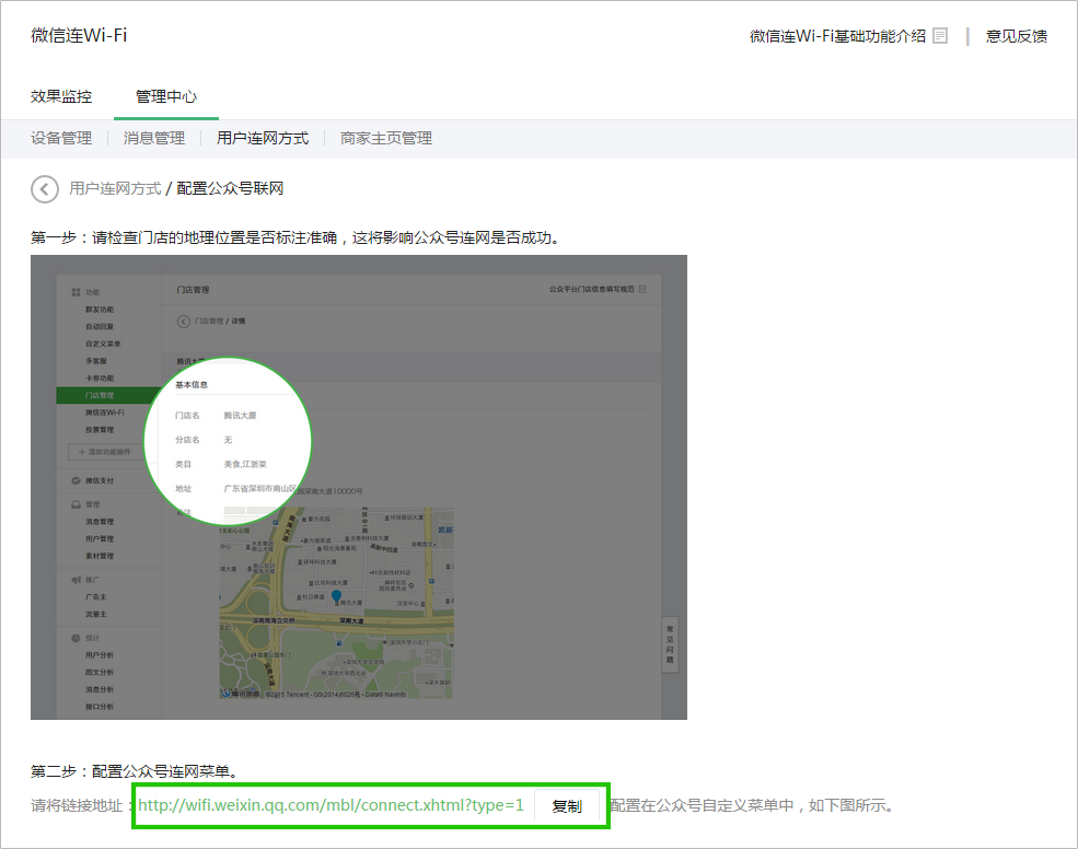A:支持配置到多家門店。請在公眾平臺準(zhǔn)確設(shè)置各家門店的地址位置和對應(yīng)的所有網(wǎng)絡(luò)設(shè)備信息,到店顧客點擊微信連WiFi菜單時、微信后臺即開始檢測此門店的網(wǎng)絡(luò)信號、并結(jié)合門店在公眾平臺配置的地理位置等相關(guān)信息、幫助顧客自動連接到店里WiFi。