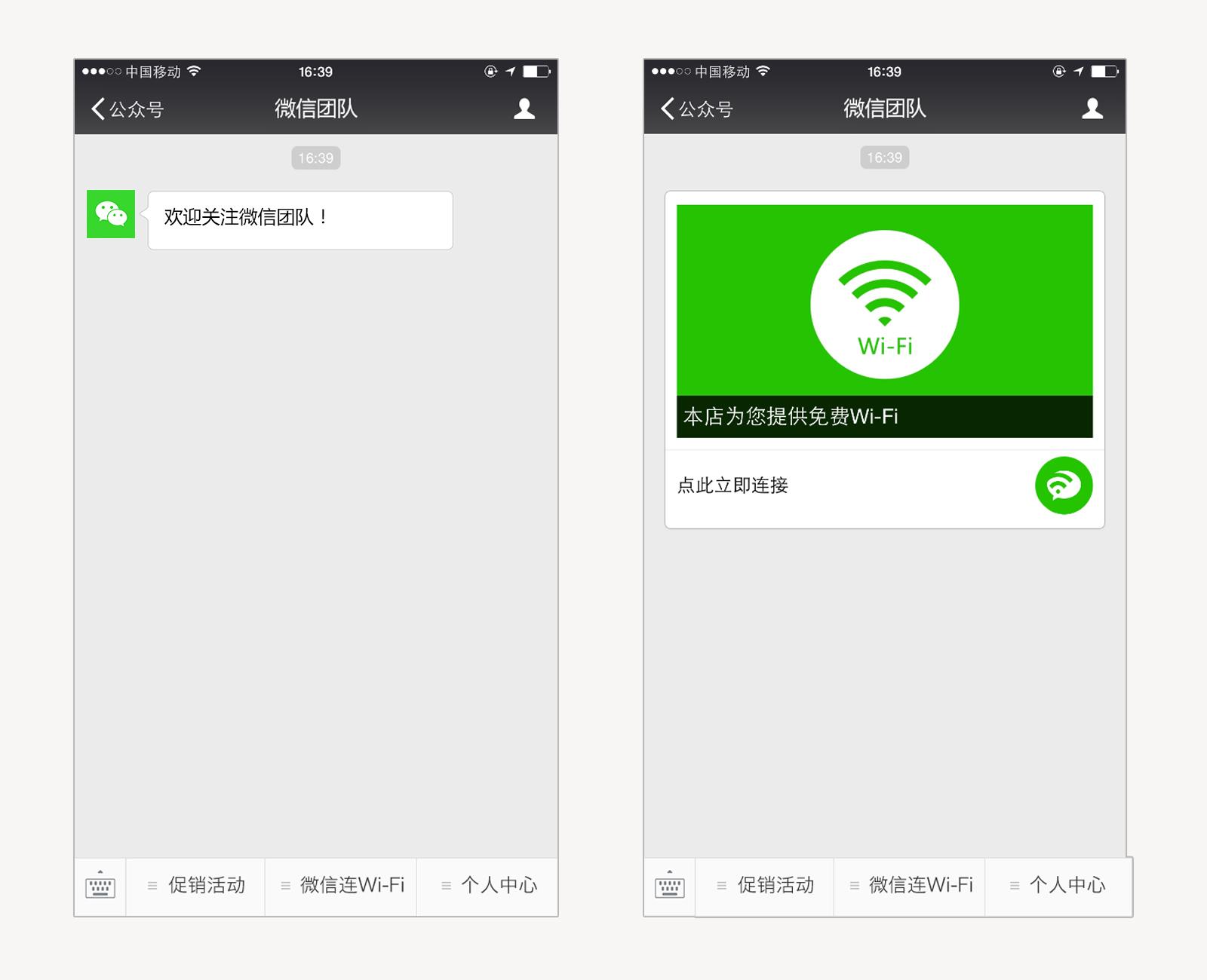 A:顧客關(guān)注此公眾號后,有兩種方法連上Wi-Fi:1.點擊公眾號 “微信連Wi-Fi” 菜單,一鍵連接Wi-Fi;2.打開公眾號時,微信后臺會自動定位和檢測Wi-Fi信號,同時下發(fā)連網(wǎng)消息,點擊消息即可連接Wi-Fi。