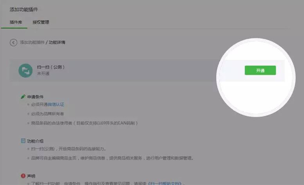登錄微信公眾平臺(tái)-> 點(diǎn)擊左側(cè)的“添加功能插件”-> 選擇“掃一掃”-> 點(diǎn)擊“開通”。