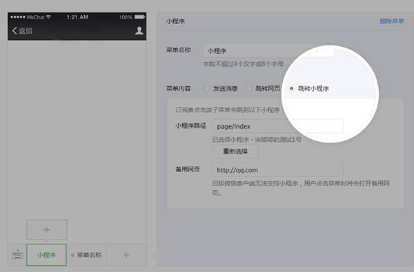 已認證的公眾號,可將已關聯的小程序頁面放置到自定義菜單中,用戶點擊后可打開該小程序頁面。公眾號運營者可在公眾平臺進行設置,也可以通過自定義菜單接口進行設置。
