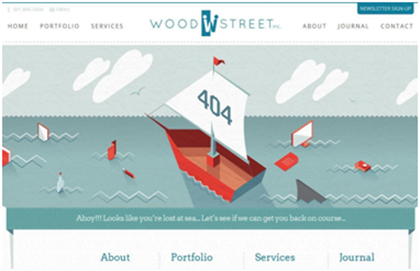 Woodstreet的404頁面也證明了他們的能力,它404頁面中的“Ahoy”讓人似乎聽到了海上人們的吶喊,漂浮的船只、隱現的鯊魚鰭,甚至還有幾臺辦公設備。讓原本焦躁的用戶慢慢平靜了下來,被Woodstreet的設計吸引。