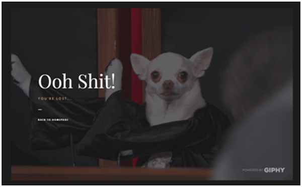 設計公司Dogstudio的404頁面上有一個狗狗動圖,似乎狗狗真的說了“Ooh shit!”(表不滿),將人們看到404錯誤頁面時的不爽表現了出來。相信看到這么個錯誤頁面,你的不滿會瞬間消失。