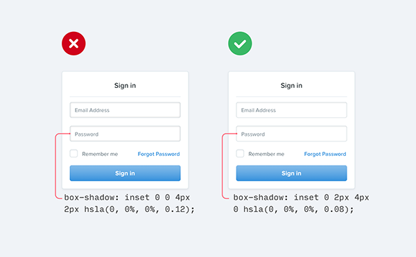 與大面積擴散模糊陰影相比,使用微妙的垂直偏移陰影效果更明顯,更自然,它模擬了最常見的光源特征,光線從上往下照下來從而營造陰影效果,如果你對此有興趣,Material Design Guideline非常清晰講述了這樣陰影的制作細節。