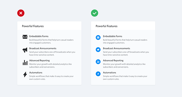 這樣做不僅能讓圖標達到預期的視覺體積,而且看起來效果更佳,當然,如果你手頭不是那么緊的話,較好還是買幾個大尺寸的高素質圖標,比如 Heroicons 或 Iconic。