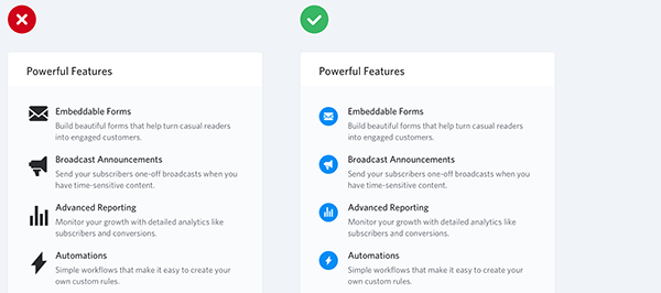 當設計著陸頁的時候,可以會突出產品的功能,這時你需要一些大的圖標作為視覺錨點,這樣的話你很可能會去 Font Awesome 或 Zondicons 這樣的網站找幾個免費的矢量圖標,然后將其放大到你所需要的尺寸。雖說矢量圖可以無損的放大,但是一個通常只有16×16 的圖標放大三四倍,它固然無損,但是在視覺上就顯得頗為不專注了:缺乏細節,總感覺過于矮胖。