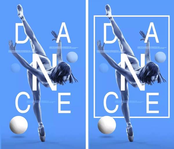 從左到右只是有無線框的差距,但在視覺上卻有形成了很大的反差,左側(cè)無線框元素的海報,給人的感覺是:視覺元素不夠整體化,而且因為視覺元素多且沒有形成很好的相互約束作用,反而有點雜亂;而右側(cè)僅僅通過添加一個線框元素,將眾多元素規(guī)為一個整體,劃定視覺范圍,使得畫面整體性提升了很多,而且看似元素很多,但是正是因為線框的約束能力,畫面非但沒有雜亂的感覺,反而相對左側(cè)畫面整體來看給人的感覺更加整齊!