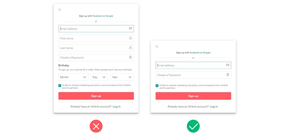 如:Airbnb的注冊表單,允許用戶通過郵箱進行注冊,但需要一并填寫姓名和生日,其實姓名和生日并不會影響用戶對網站進行瀏覽,并且涉及到個人隱私,用戶可能并不愿意在不熟悉產品的情況下就填寫,所以沒有必要在注冊的過程中進行填寫。在注冊的時候,只需要填寫郵箱和密碼,而姓名和生日在需要時在進行完善體驗會更好。