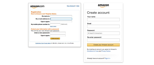 逼單字段過多,給人一種好多信息需要填,很麻煩的沉重感,以致于用戶在填寫過程中無法保持好心情,若是登錄注冊的表單,很可能因此流失部分用戶。所以,我們應該修改填充內容,盡可能的刪減掉額外的無用字段。如:亞馬遜注冊頁面的改版充分體現了這一點,舊版中,標簽內容用了描述性的語句,但其實短短幾個字已經足夠表明意思。