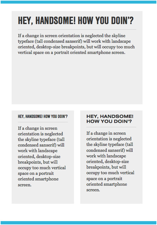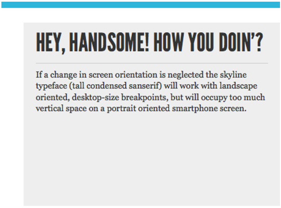 如果忽略屏幕方向和屏幕分辨率的變化,那么頂端skyline由多個字詞組成的標題(比如說瘦長的無襯線字體)應該能夠對橫向電腦桌面大小的節(jié)點起很好的作用,但在智能手機直式方向上可能會占用太多垂直空間,尤其是原文一行的標題在智能機上要轉成兩行。雖然調小字體大小來調整有一定作用,但是效果未必能比在臺式電腦的文本清晰。