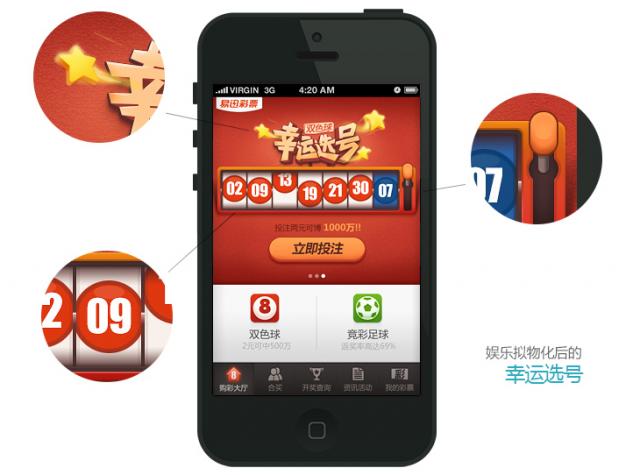 經(jīng)過分析、思考和討論,我們提出了移動端趣味購彩新體驗的概念。希望產(chǎn)品在基本購彩功能的基礎(chǔ)上,通過增加選購流程的趣味性和娛樂性整體提升用戶的購彩體驗。在確定好產(chǎn)品方向后,設(shè)計師們的思考重點放在如何能通過視覺突出彩票的娛樂化氛圍,使購彩更加趣味化這個問題上。經(jīng)過反復(fù)斟酌我們確定了幾個設(shè)計方向:
