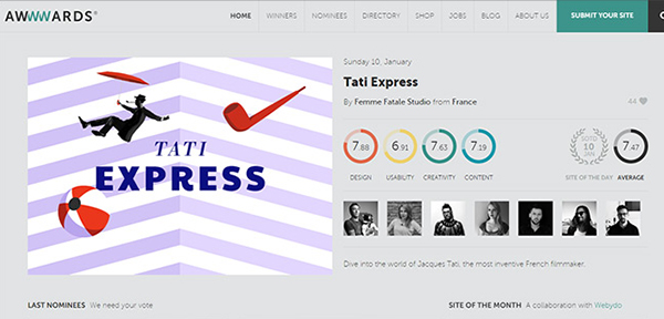 Awwwards不只是一個(gè)展示網(wǎng)頁設(shè)計(jì)的網(wǎng)站,它邀請(qǐng)一些有地位的設(shè)計(jì)師、博客和機(jī)構(gòu)組成一個(gè)多學(xué)科的評(píng)審小組對(duì)設(shè)計(jì)師的網(wǎng)頁設(shè)計(jì)進(jìn)行評(píng)分,大家可以查看獲獎(jiǎng)?wù)呒氨惶崦说淖髌罚珹wwwards也會(huì)舉辦會(huì)議來嘉獎(jiǎng)那些對(duì)網(wǎng)頁設(shè)計(jì)做出貢獻(xiàn)的獲獎(jiǎng)?wù)撸矔?huì)幫助相關(guān)機(jī)構(gòu)發(fā)布招聘信息。與此同時(shí),Awwwards還擁有自己的網(wǎng)上商店用于售賣網(wǎng)頁設(shè)計(jì)相關(guān)書籍。