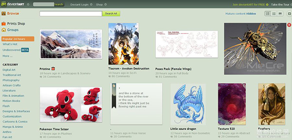Deviant Art是屬于一個(gè)社區(qū)網(wǎng)站,你可以在里面找到數(shù)碼設(shè)計(jì)、皮膚、主題、壁紙等圖片,還有傳統(tǒng)藝術(shù)、攝影、詩歌、散文以及藝術(shù)圖案等精美的設(shè)計(jì)案例,有利于幫助你很好的尋找靈感,設(shè)計(jì)出更多的精美的作品。