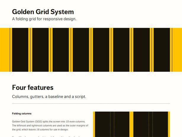 Joni Korpi的開發和Less Framework是同一人,近期已經發布了這個可靠的Grid系統的新版本。因為其易于適應從16個到8個到4個欄,被視為“折疊式”。Golden Grid System還具有另一個特色,可以在測試時用一個小型瀏覽器覆蓋您所制作的頁面上的Grid。