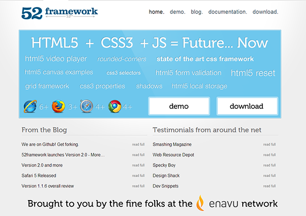 52 Framework主要用于優化HTML5和CSS3的跨瀏覽器兼容性的框架,可在所有主流瀏覽器上運行。