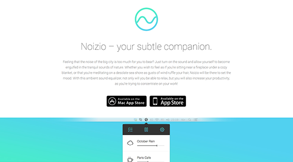 很多的時候當設計師沒有靈感時,會選擇去一些有情調的地方,如:咖啡廳來尋找創作的氛圍,Noizio將能夠很好的幫你將這種氛圍帶到家中。Noiz.io提供了十月雨聲、喧鬧的巴黎咖啡廳、雷雨聲等10種不同的白噪音音效,不僅如此,設計師還能夠依據用戶要求,或者是用戶的喜好來隨時的混搭音效。
