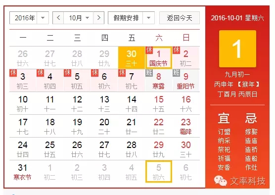 根據《國務院關于2016放假安排表的通知》,天津網站建設-文率科技2016十一放假時間安排:放假7天,即10月1日至10月7日。10月8號(星期六),10月9號(星期天)正常上班。