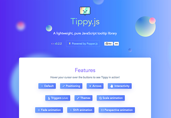 Tippy是一款輕量級(jí)的純JS工具提示庫,其中包含了大量不同的交互相關(guān)的提示內(nèi)容,它的出現(xiàn)對(duì)設(shè)計(jì)師的工作有很大的幫助,并且它的兼容性非常的好,幾乎可以適用于任何瀏覽器,這也使得它幾乎可以輕松實(shí)現(xiàn)各種各樣的提示效果。