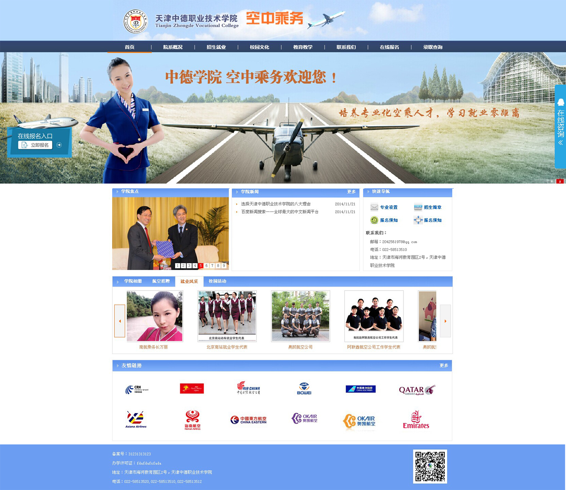 學院以國際合作為依托,校企合作為支撐,按照企業提出的人才培養目標和知識能力結構,校企共同制定人才培養計劃,師資、技術、辦學條件合作共享、工學交替進行,學生畢業直接到用人單位就業,企業避免了人才選擇的盲目性,學生就業有了保障,是有利于擴大就業的高技能人才培養模式。該校特色專注空中乘務與航空服務注重理論和實踐相結合,開展多證教育,擁有高配置的計算機室、語音室、形體訓練室、禮儀化妝室、飛機模擬艙等教學設施。與此同時,我們通過校企合作,與多家企業以形成“訂單式”培養的模式。為在校生提供了安全、高薪的民航相關工作。目前已為國內外各大航空公司、機場等輸送畢業生達8000多名畢業生,贏得了民航總局及學生家長的一致認可與好評,被譽為業內奇跡。
